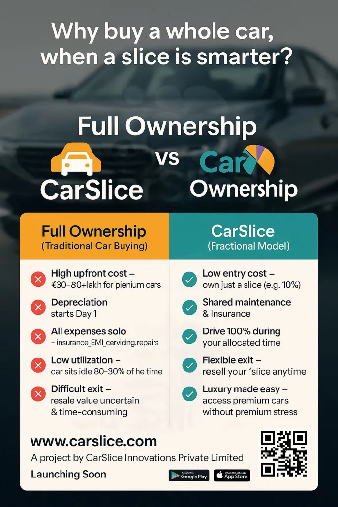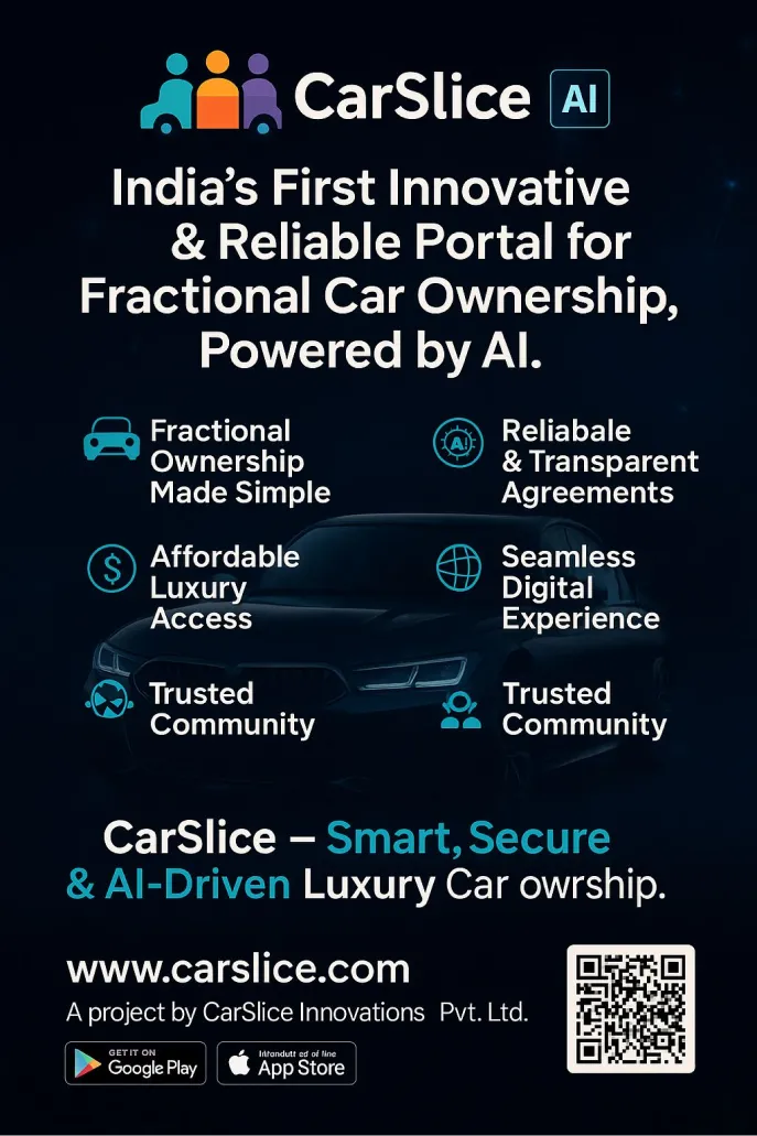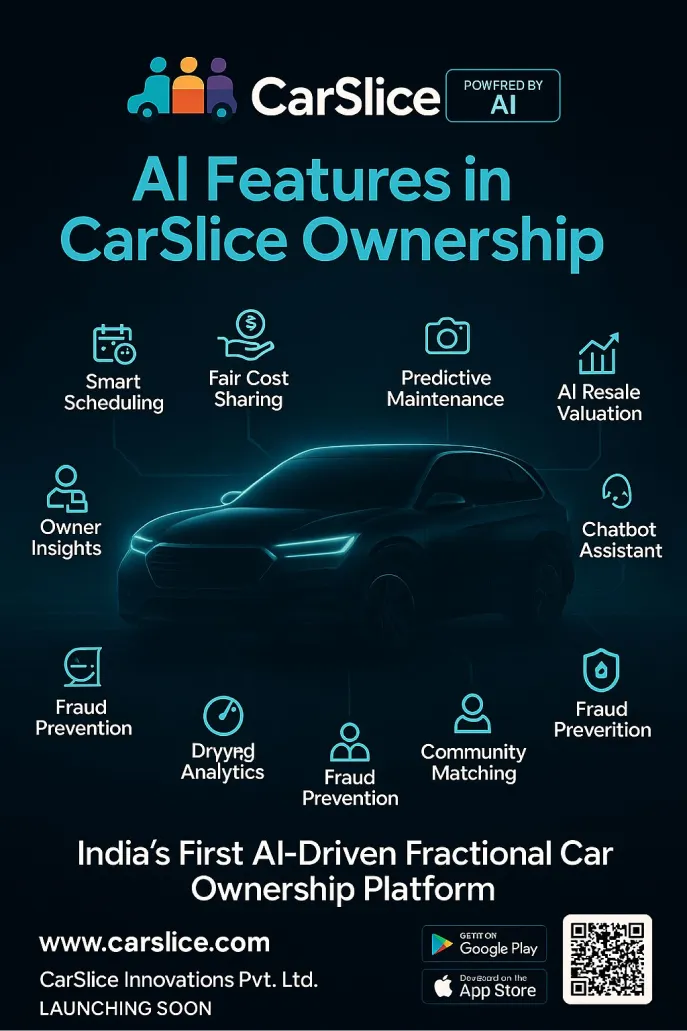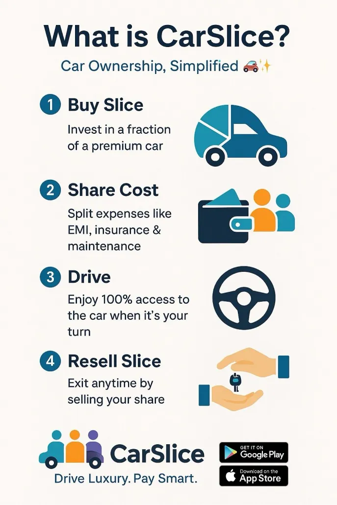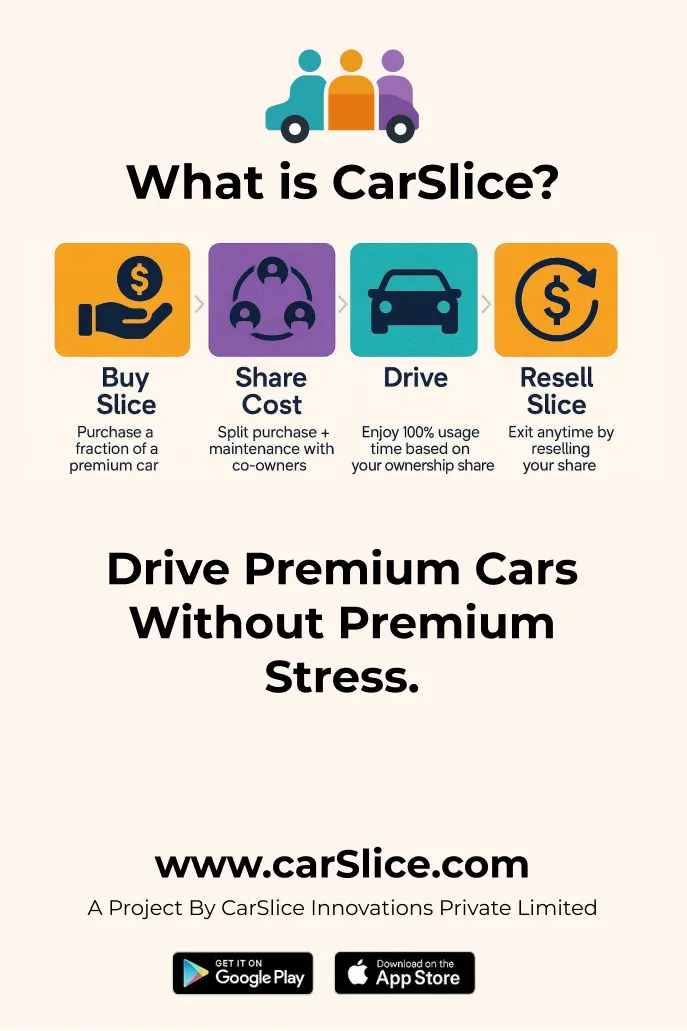 CarSlice is India’s first AI-powered fractional car ownership platform that allows multiple verified users to co-own a single car, share its usage, and even switch between cars — just like owning shares in multiple vehicles.